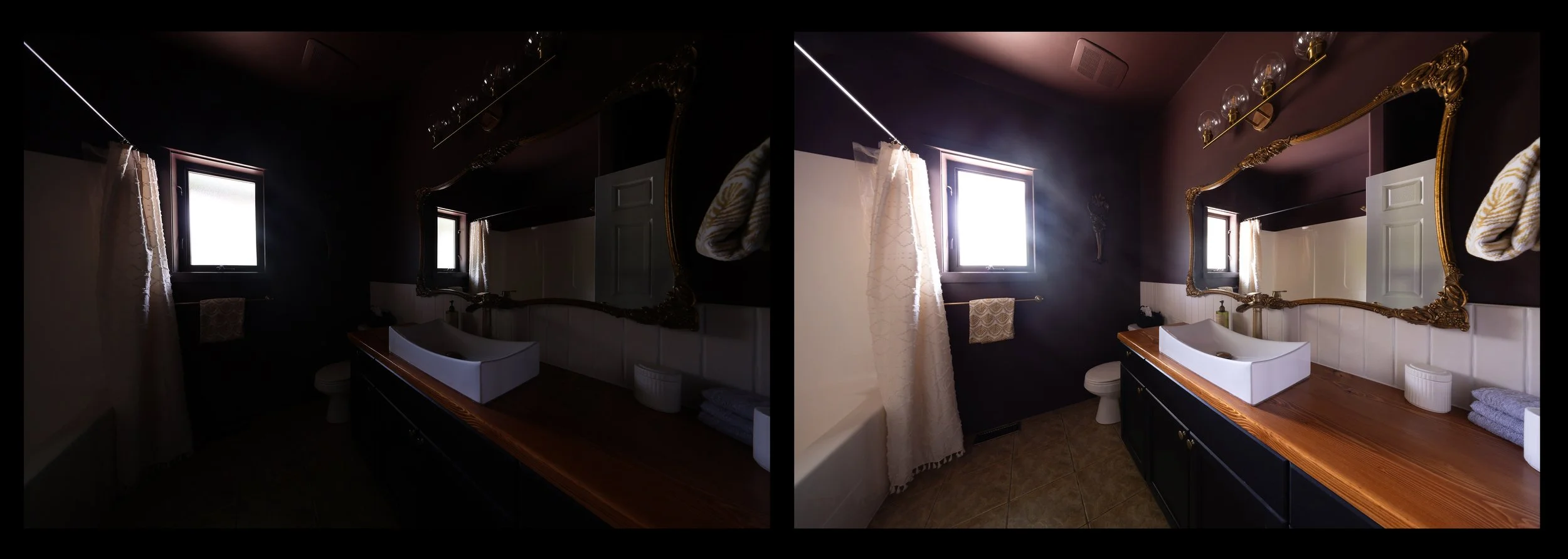 The other challenge is when there is little or no light source for an interior shot. Cameras are better at seeing in the dark — they can have longer shutter speeds, higher ISO and be stabilized by a tripod for a crisp bright image. Because bathroom in the above image is painted dark purple and only has one window it is rather dimly lit. In the lighter image on the right hand side (I was shooting in aperture priority mode), the shutter stayed open a long time — almost a full second. Because I did not adjust the ISO accordingly (I could have bumped it up to 2000 ISO) a haze is created around the window. The mystery behind this haze is fascinating.