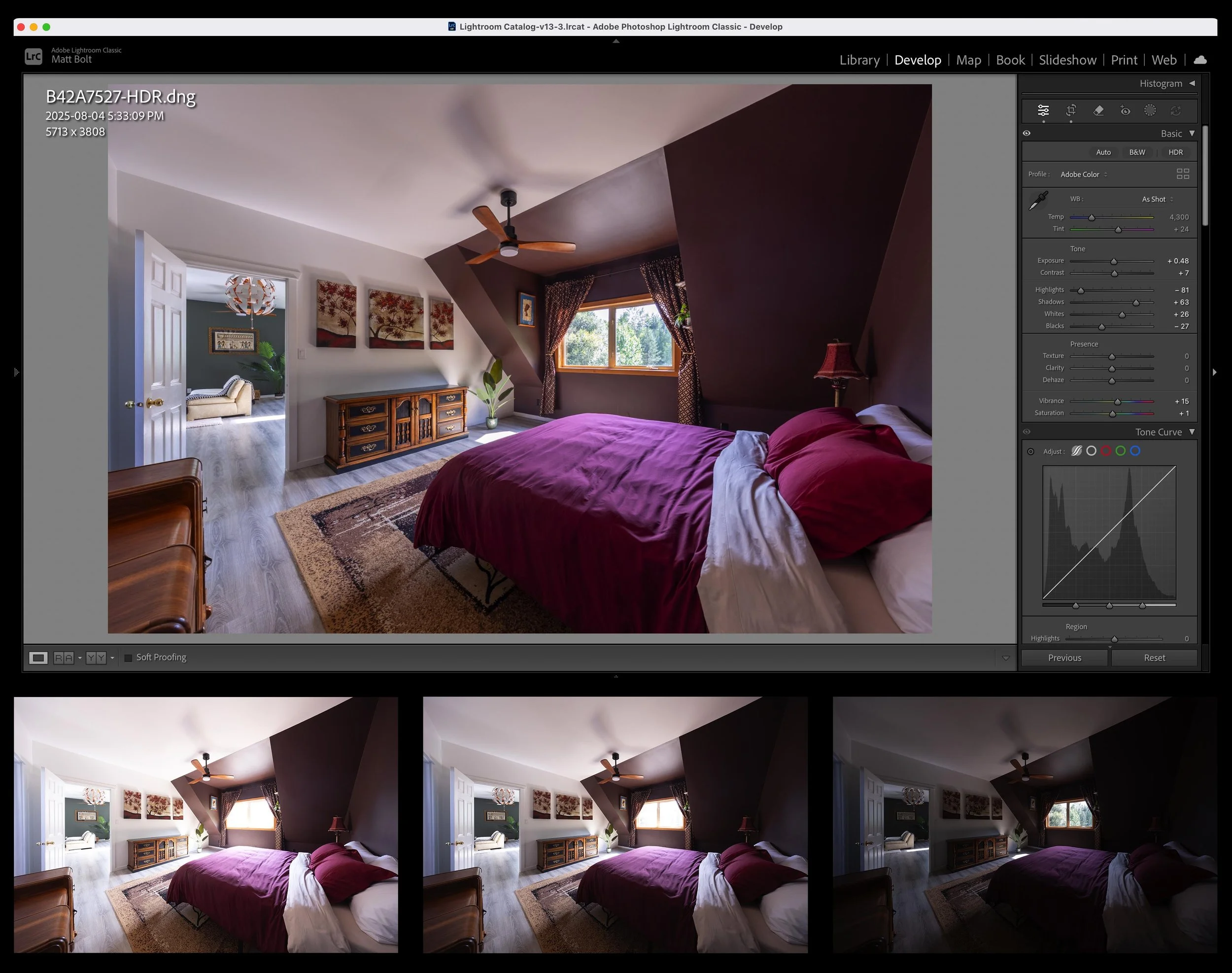 A screenshot of an HDR blend in Lightroom. The screenshot is the result of blending the bottom 3 images. The resulting blended image is very “flat”. Below is a quote from Kenrockwell on HDR photography